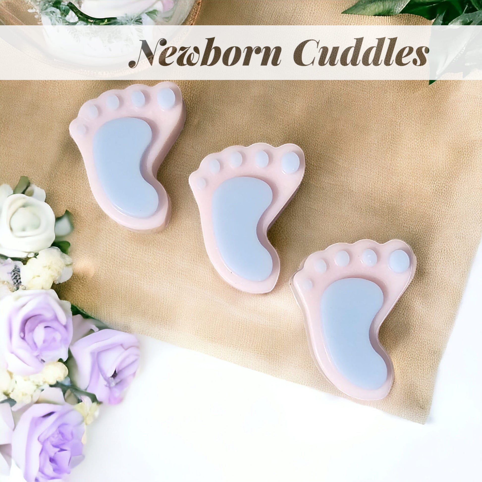 Each melt is carefully hand poured and shaped into baby feet molds. Each foot shape will come with pink and blue colouring as shown in image. Please note colours may vary in shade of pink and blue as each melt is handmade.