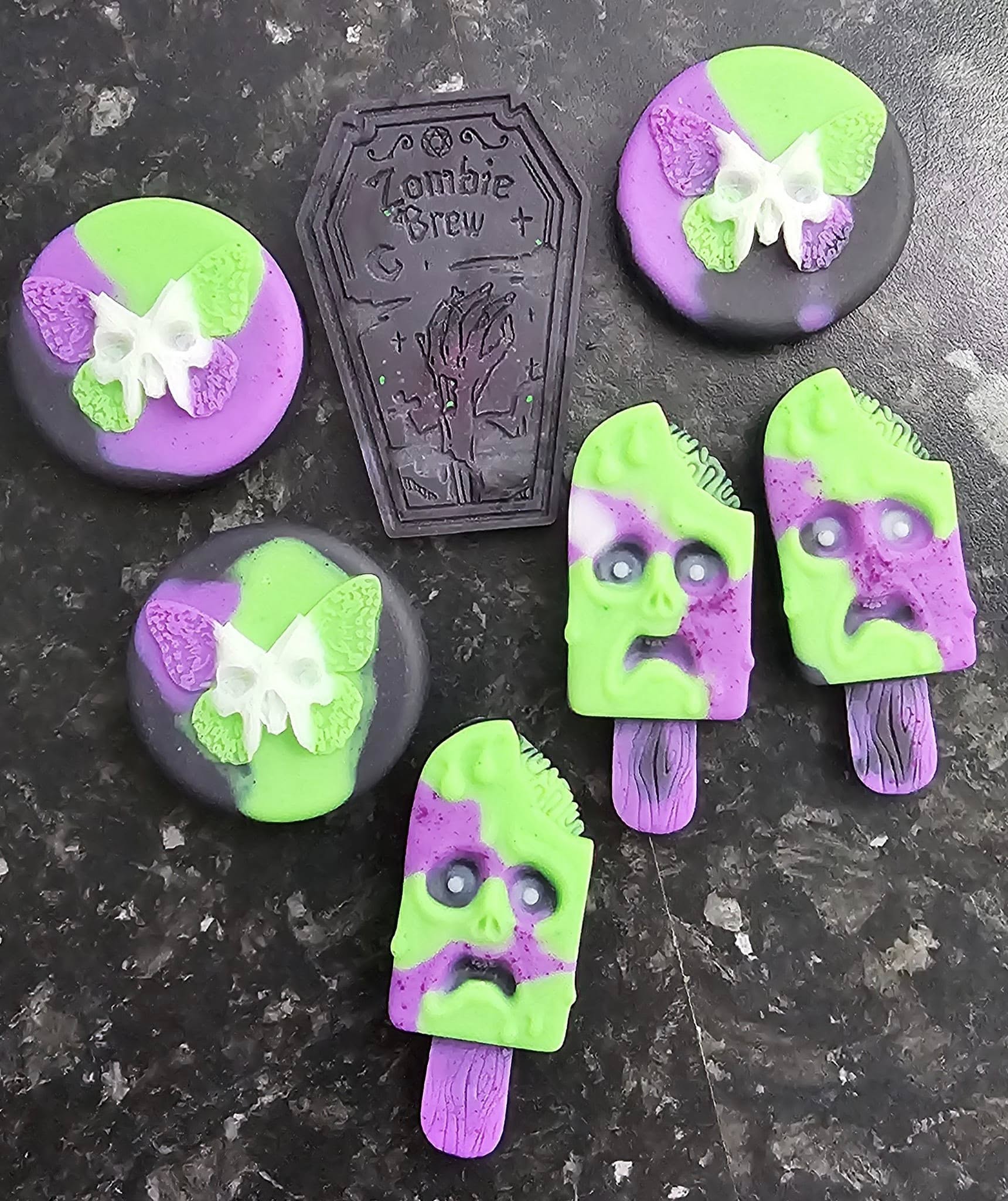 Please note, each melt colour may vary and each wax mold may vary. You may receive a pumpkin, lolly, circle with butterfly imprint or gravestone shape mold and each melt could be a different colour but will be clearly labelled as to the fragrance.